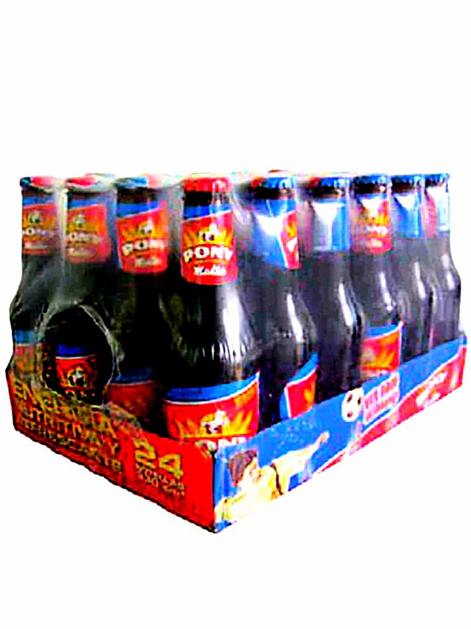 A case of 24 bottles of Pony Malta, a non-alcoholic malt beverage popular for its energizing qualities.