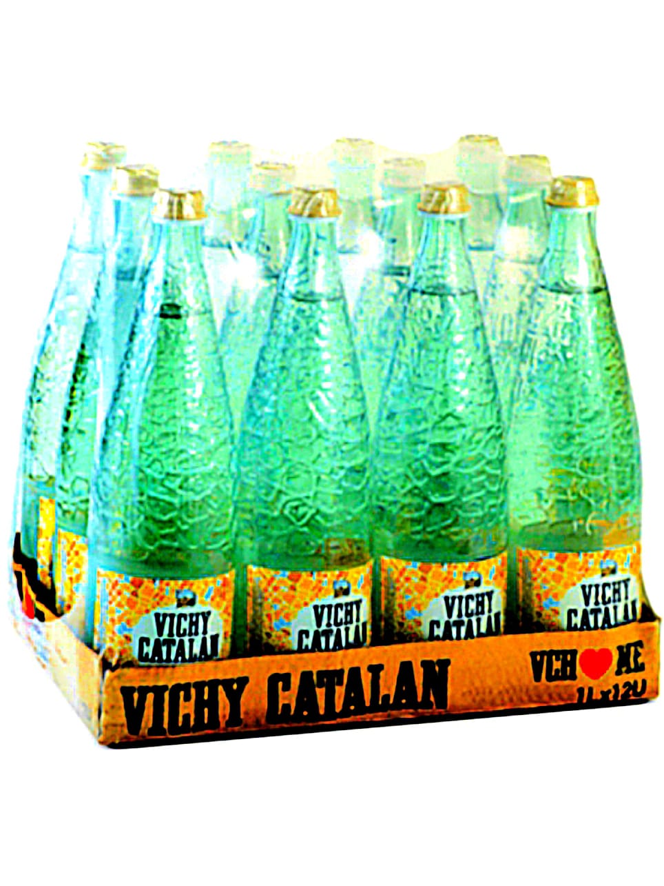 A case of Vichy Catalan, a premium sparkling mineral water from Spain, known for its high mineral content and distinctive taste.